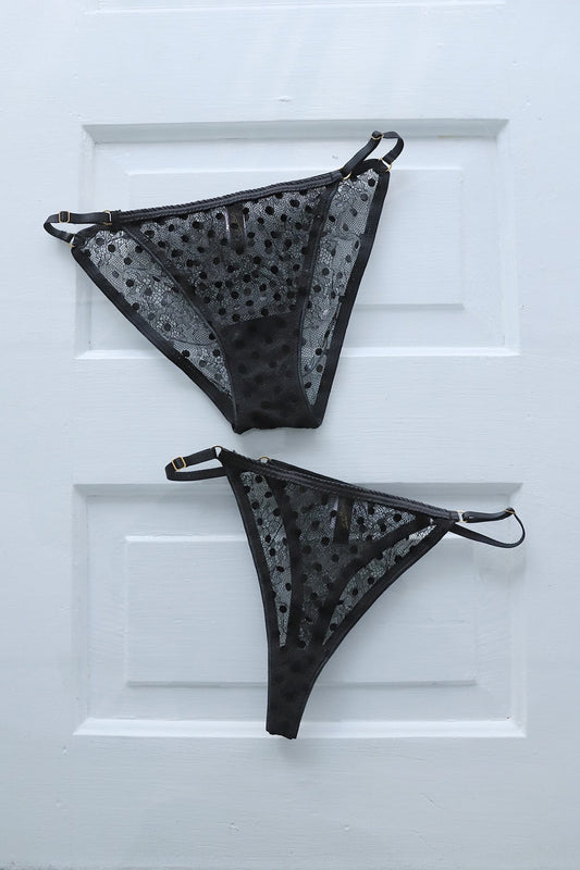全蕾絲奢華製作,設計精美的丁字褲,兩側一樣是Gemini Tale標誌性可調整多織帶設計。可調節設計、設計適合各種身材的人穿著。再也不用擔心身形變動。正面有兩層,皮膚一側有網紗,防止透視。背面僅單層蕾絲,蕾絲圖案與皮膚相襯、若隱若現。蕾絲有彈性,緊貼肌膚,圖案像是一片片精緻的葉子。顏色是經典的黑色和平靜的藍綠色。