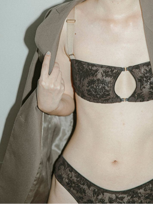 這款內衣採用前開扣設計,呈現束胸風格,穿上後猶如小可愛背心,搭配透膚衣物時也不會顯得像內衣,兼具實用性與高時尚感。 寬版肩帶提供穩定的穿著體驗,並因肩帶設置於外側,能完美修飾鎖骨線條。 顏色選擇 黑色:黑色彈性蕾絲搭配黑色絨毛印花 棕色:棕色彈性蕾絲搭配黑色絨毛印花此外,肩帶採用撞色設計,展現出GEMINItale的獨特風格。 材質與特色面料為彈性蕾絲,搭配絨毛印花,帶有絲絨般的奢華氛圍。雖然是無襯墊設計,但透過材質與結構,能有效避免過於明顯的問題。若您希望加強胸部防護,內側設計有可插墊空間,可使用自備胸墊,或者選購專用半圓胸墊(若尺寸不符,亦可修剪後使用)。購買連結:https://cocoonbra.com/products/pad-3 【尺寸】可透過調整肩帶調整尺寸: Size 1 65B-E罩杯相當 70B-D罩杯相當 Size 2 65E-G罩杯相當 70D-F罩杯相當...