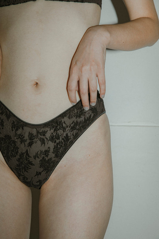 這款高腿設計的內褲具有顯腿效果,獨特的曲線設計搭配天鵝絨質感蕾絲,展現細緻工藝。