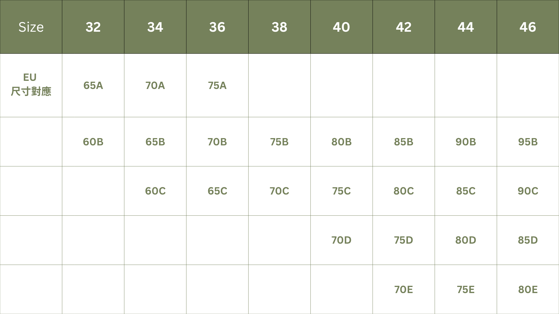 EU 80C-75D-70E以上 (Size 42以上):無鋼圈交疊型設計(cache-cœur),提供最佳支撐同時保留優雅線條。