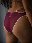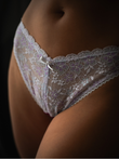 This handcrafted tanga features deep purple comfortable, breathable stretch tulle at the back, creating striking contrast with the soft pastel tones of the front, producing layered visual effects.