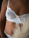 The entire lingerie set is crafted from two different white laces: the back features white eyelash lace (Dentelle à cils), while the bust uses natural white lace (Dentelle écrue). These two layers of white lace create visual depth and dimensional beauty.