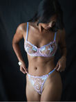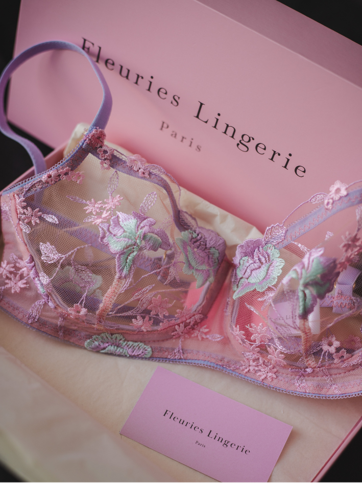 這款手工法式半罩杯以柔美的粉紫刺繡蕾絲 (Dentelle brodée) 為主調。設計靈感源自法國春天,當巴黎城市與公園繽紛的花慢慢盛放,愜意的在陽光下野餐、閒談,享受自在而浪漫的午後時光,期待仲夏日的到來