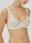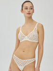 - 這款內衣是由半透明的格紋米白色彈性網布製成。